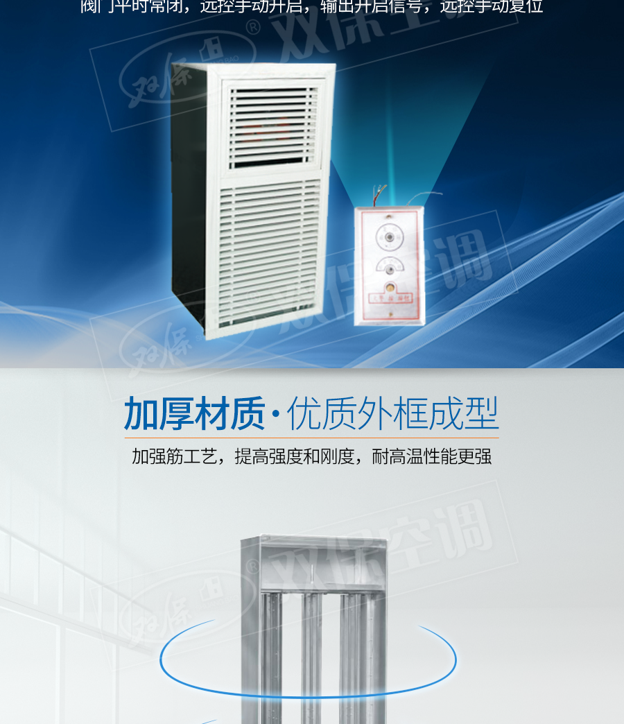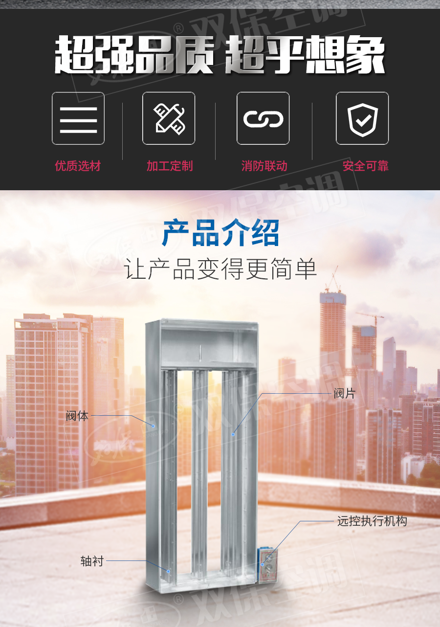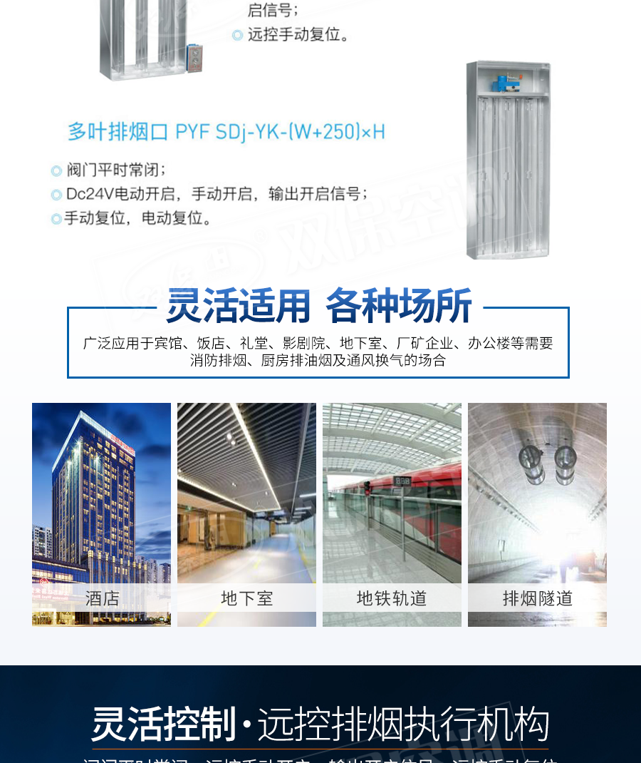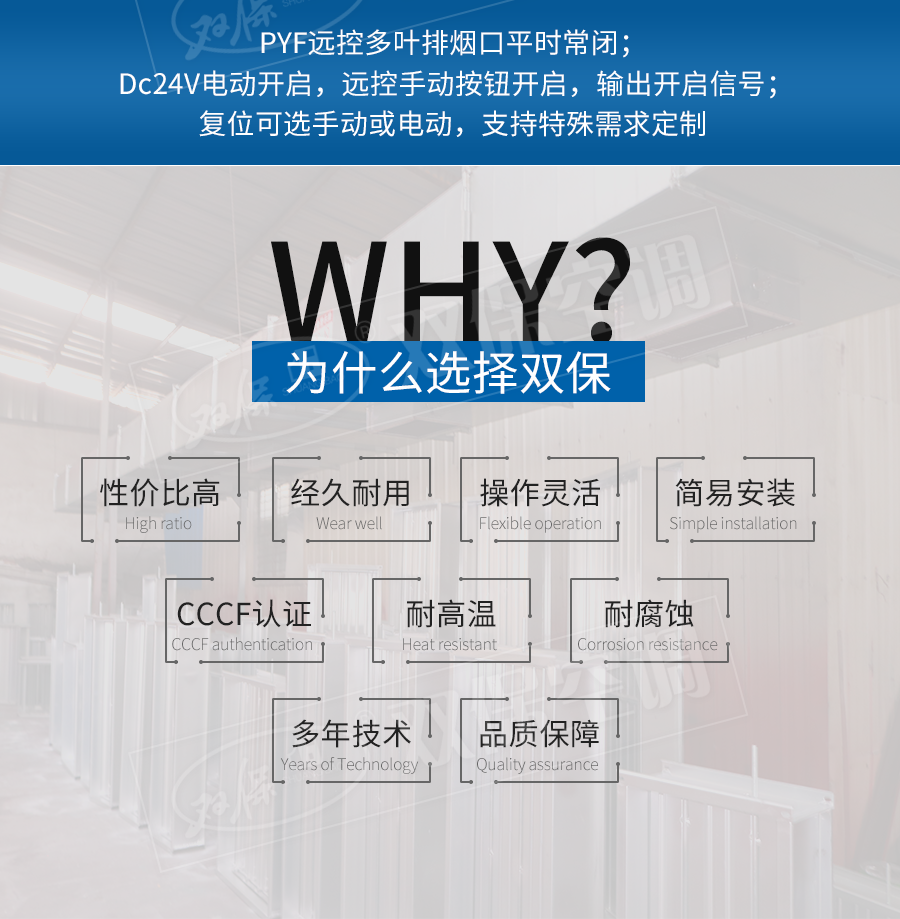 江蘇雙保空調有限公司—遠控多葉排煙口 閥門平時常閉; Dc24V電動開啟,遠控手動按鈕開啟,輸出開信號; 遠控手動復位。