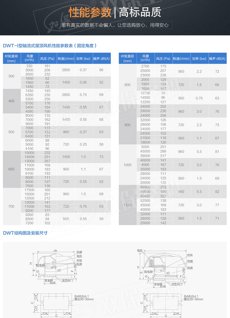 江蘇雙保空調有限公司—DWT系列屋頂風機分為二大類型。其一,軸流式屋頂風機:型號為DWT-I型適用于中低壓,大流量的使用場合。其二,離心式屋頂風機:型號為DWT-Ⅱ型、DWT-Ⅲ型二種型式,宜適用于風量較小而壓力要求較高的場合。