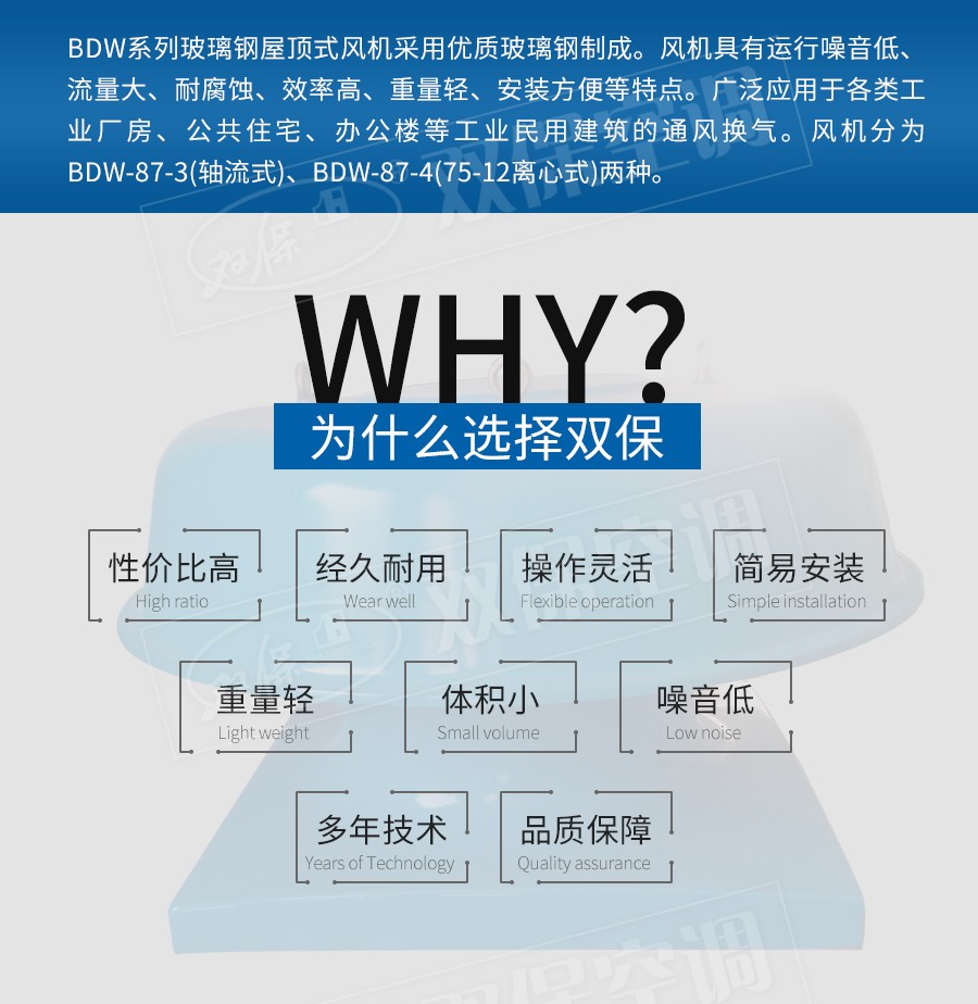 江蘇雙保空調(diào)有限公司—BDW系列玻璃鋼屋頂式風(fēng)機(jī)采用優(yōu)質(zhì)玻璃鋼制成。風(fēng)機(jī)具有運(yùn)行噪音低、流量大、耐腐蝕、效率高、重量輕、安裝方便等特點(diǎn)。廣泛應(yīng)用于各類工業(yè)廠房、公共住宅、辦公樓等工業(yè)民用建筑的通風(fēng)換氣。風(fēng)機(jī)分為BDW-87-3(軸流式)、BDW-87-4(75-12離心式)兩種。