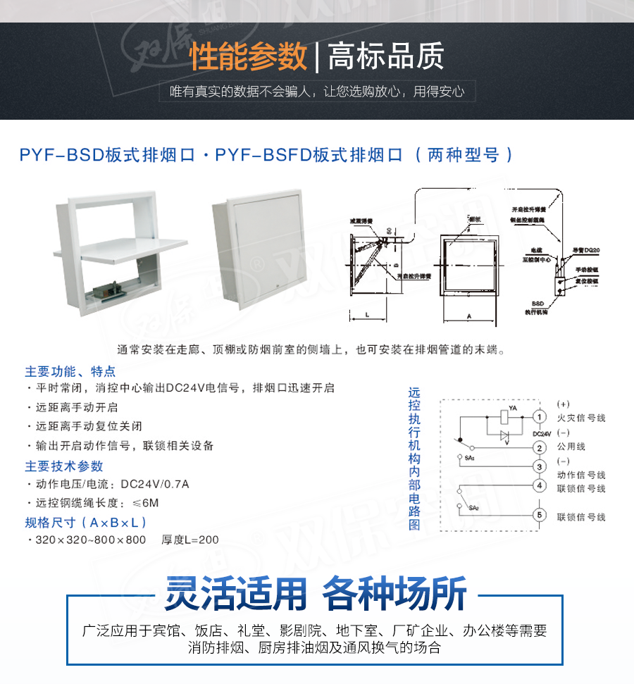 江蘇雙保空調有限公司—排煙閥PYF-SDc-YK-WxH-板式 平時常開;Dc24V電動關閉,溫感器280℃自動關閉,手動關閉,輸出關閉信號;手動復位。 板式排煙口是采用自動或手動開啟方式,設在建筑外墻或屋頂上,用來排除火災產生的熱氣和煙的開口。