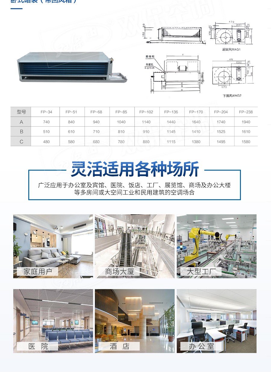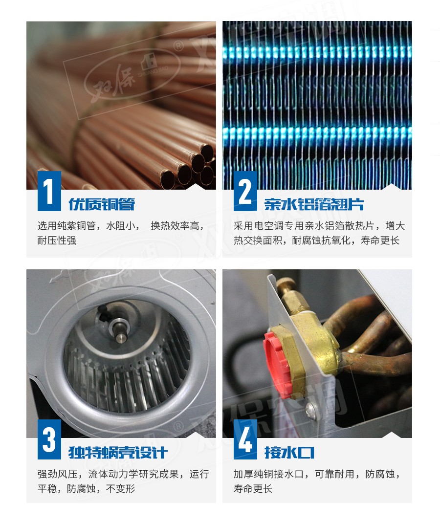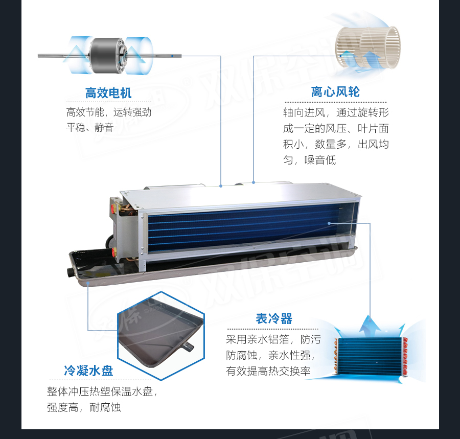 江蘇雙保空調有限公司—臥式暗裝風機盤管是中央空調理想的末端產品,其工作原理是機組內不斷的再循環所在房間或室外的空氣,使空氣通過冷水(熱水)盤管后被冷卻(加熱),以保持房間溫度的恒定。雙保風機盤管采用優質薄壁無縫紫銅管與親水鋁翅片,經液壓或機械漲管而成,傳熱系數高,韌性好,強度大,可承受高水壓,可以在超高層建筑使用。