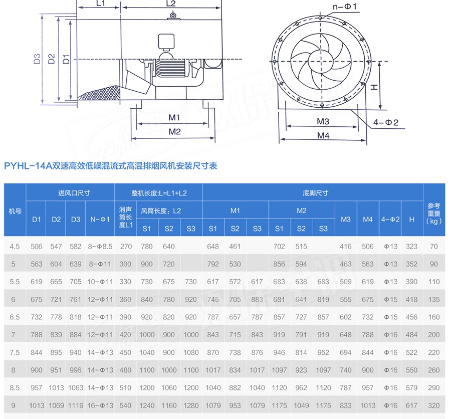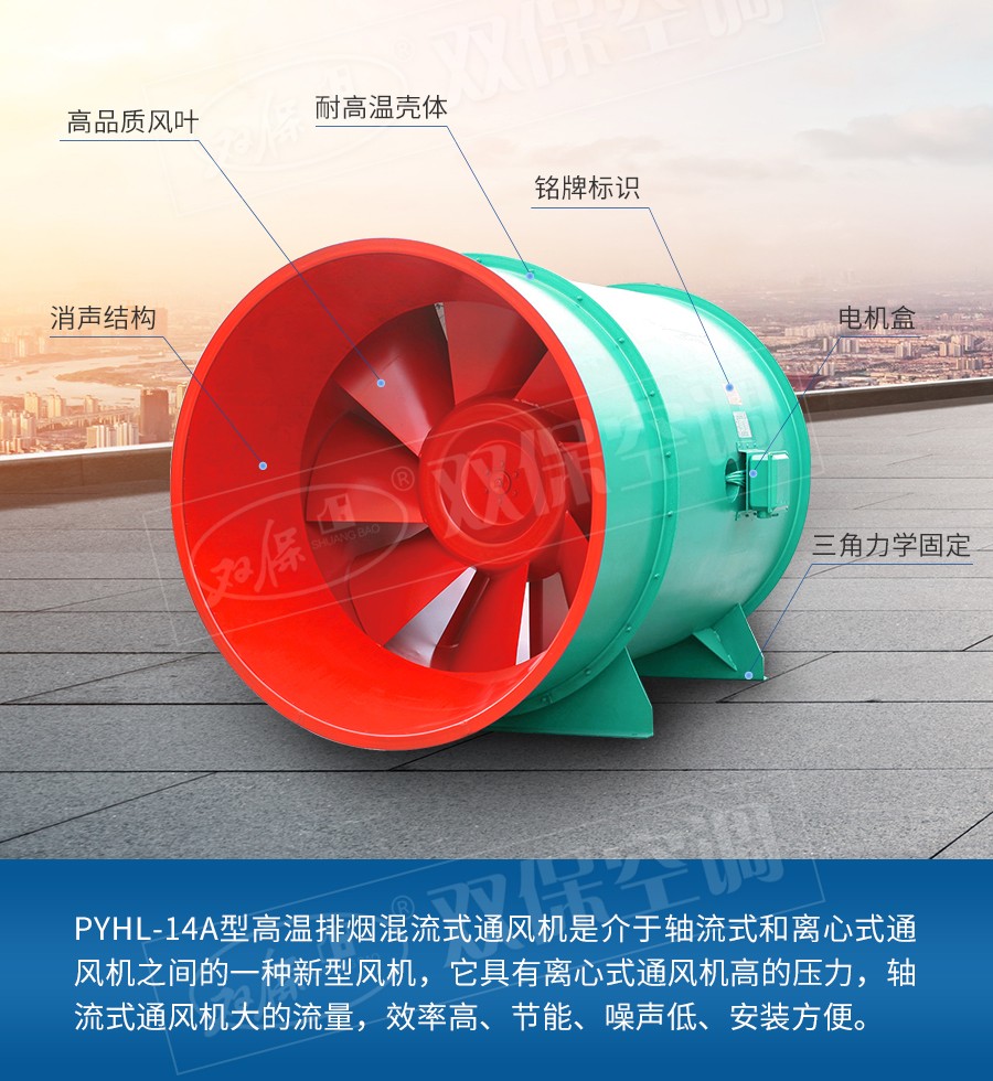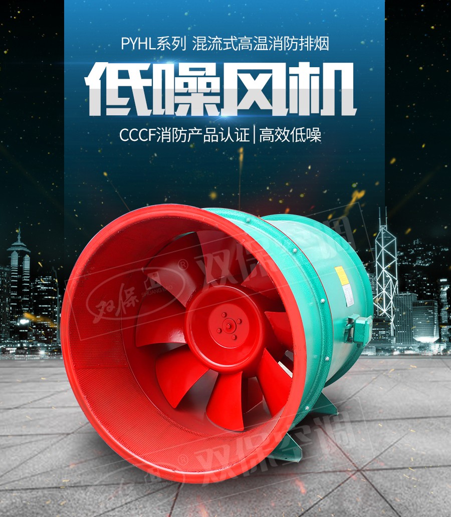 江蘇雙保空調有限公司—PYHL-14A高效低噪混流式高溫排煙風機可用于高層建筑、地下建筑的防排煙系統。具有效率高、噪聲低、用途廣,平時通風接氣與火災時消防排煙一機兩用的特點。